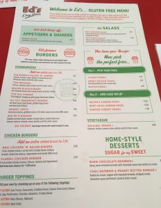 Ed’s Easy Diner – This is actually part of a national chain, but not one that we had ever heard of before, though as their website reveals, there are a number of locations across the length and breadth of the UK. There’s even one not too far from us, though I haven’t yet revealed that particular fact to M! G and M were thrilled to discover a lengthy gluten-free menu for them to pore over and whilst G was disappointed that she couldn’t select from their breakfast/brunch options, she quickly decided what her choice would be for our late lunch. We continue to encourage both children to order for themselves and to make their allergy needs known to the servers, only stepping in when it looks like the message might be misunderstood or they haven’t quite made themselves clear.