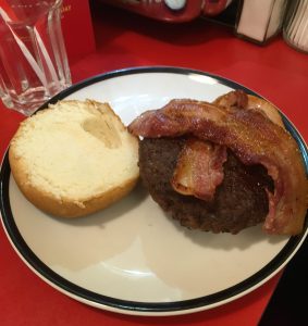 G settled on “Big Bubba’s Bacon ‘n’ Cheese” burger with gluten-free fries and without the cheese. M was desperate to have a gluten-free burger bun, so he asked for the “BBQ Chicken ‘n’ Bacon” burger – without any of the constituent ingredients apart from the grilled chicken breast, streaky bacon and the bread roll. He shared a handful of G’s gluten-free fries and enthusiastically savoured every single mouthful. Mike and I were a little disappointed that they had run out of hot dogs by the time we got to the diner for lunch, but instead shared a caesar salad, onion rings and sweet potato fries as well as a burger. All in all, this was a fantastic find and I wouldn’t hesitate to eat here again.