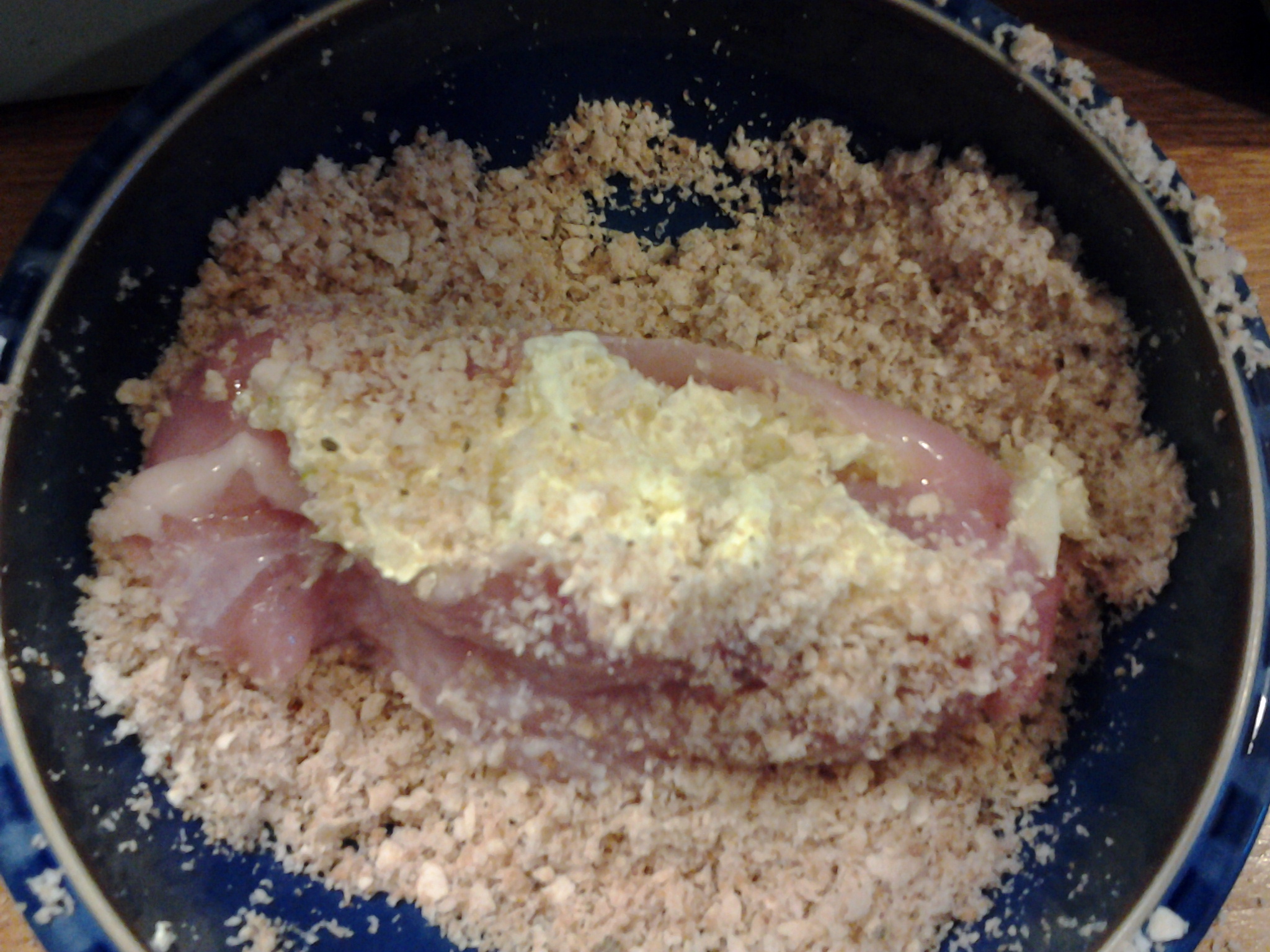 - Pinching the sides of the chicken breast together, dip into the milk before covering in the breadcrumbs. Make sure the chicken is well coated