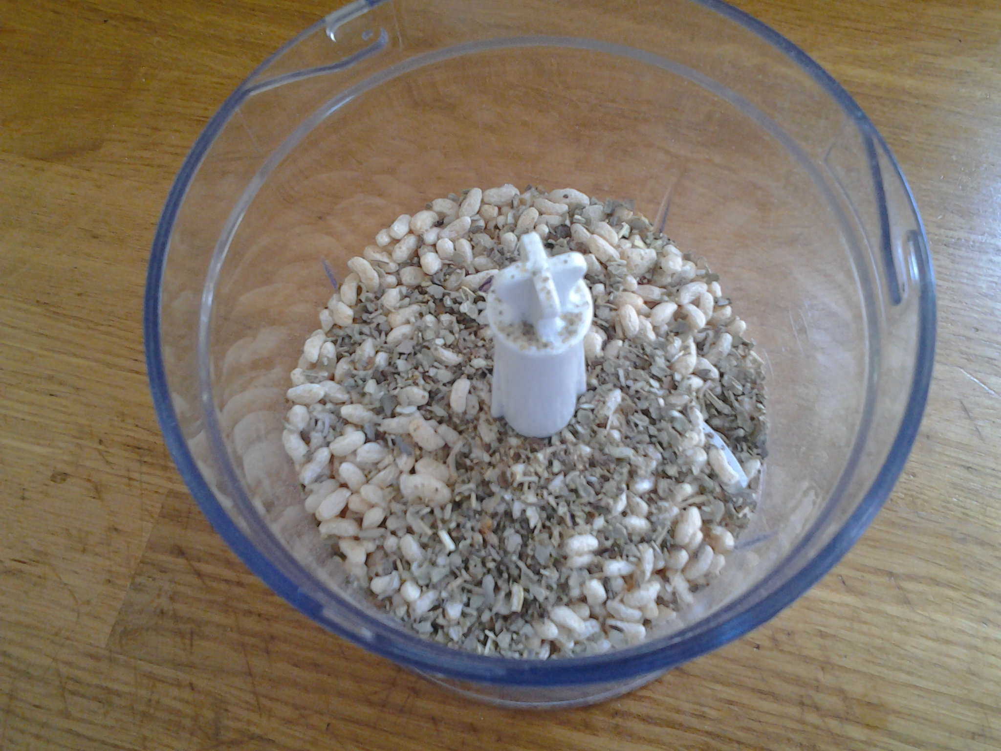 - Put the gluten-free rice krispies into a food blender and blend until they resemble breadcrumbs