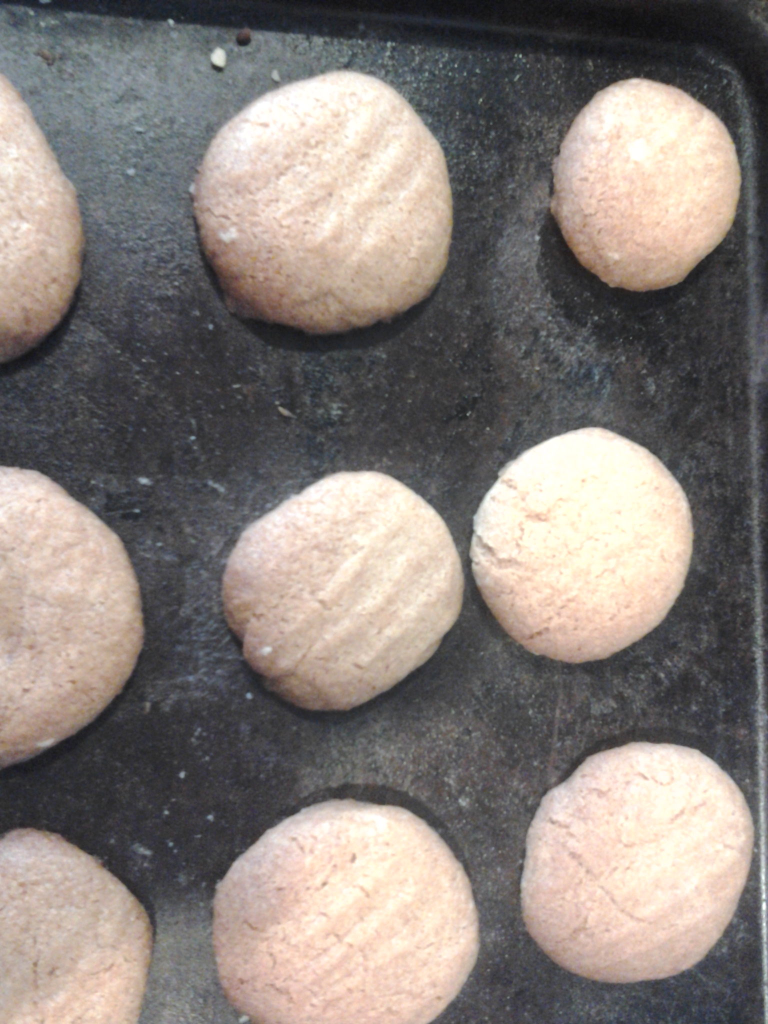 4. Once cool enough to handle, with floured hands, roll the dough into 50p-size balls. Place these individual balls onto the greased baking tray with enough room between each biscuit to allow them to spread during cooking. Mark the top of each ball with a fork. The dough should make about 30 biscuits.  20140124_104828