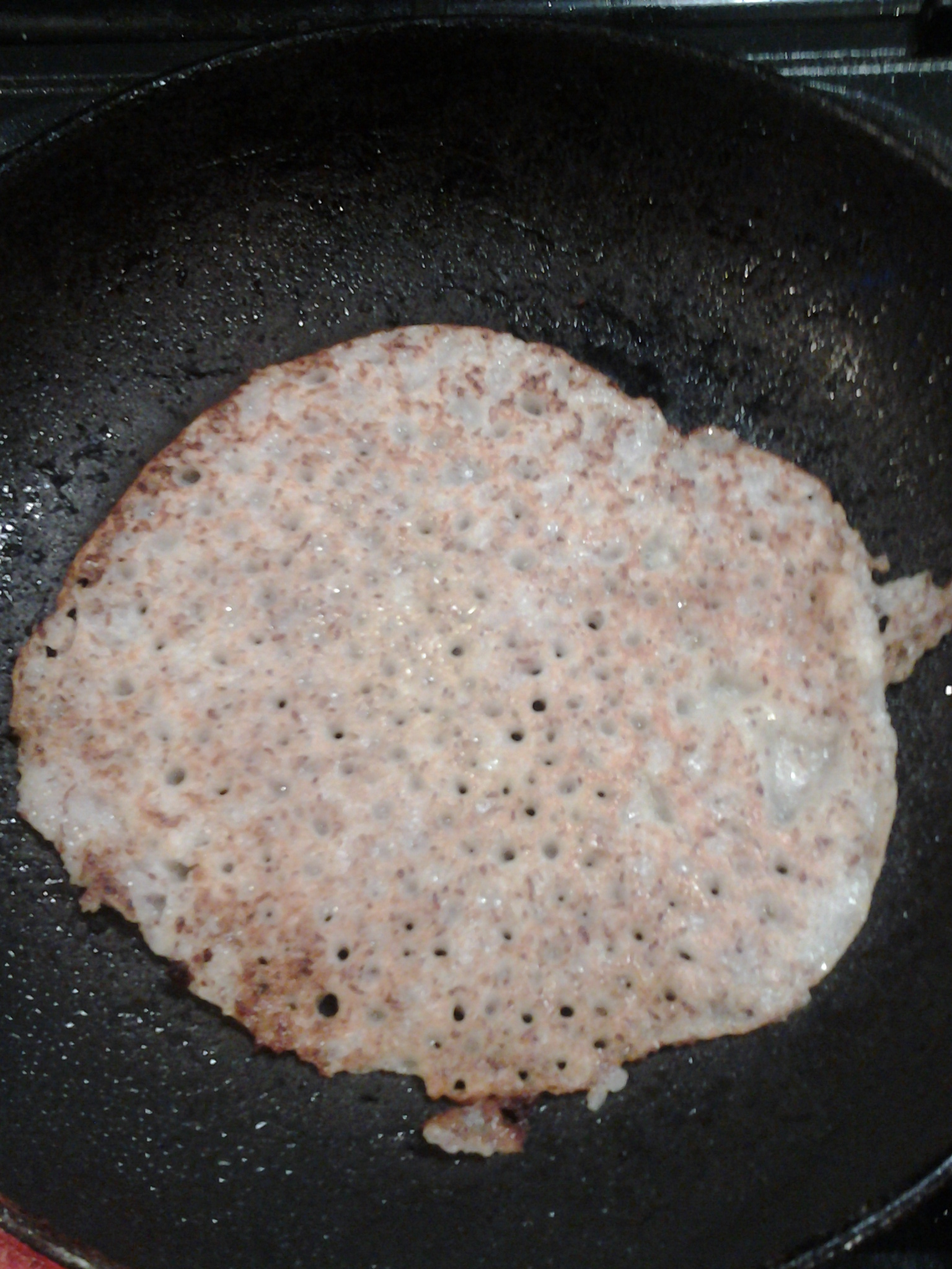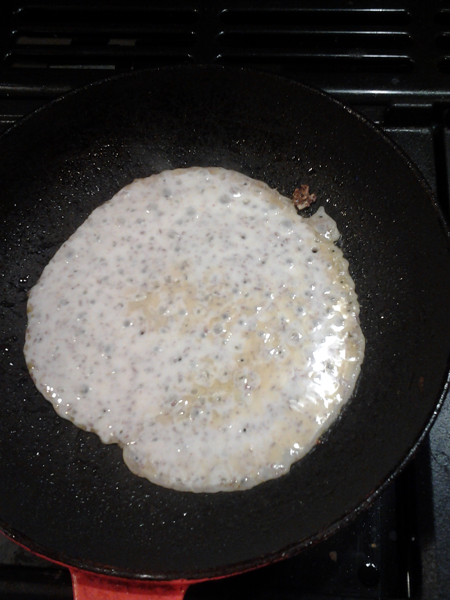 - As soon as the batter hits the hot pan, tip it around from side to side to get the base evenly coated with batter. It should take only half a minute or so to cook.