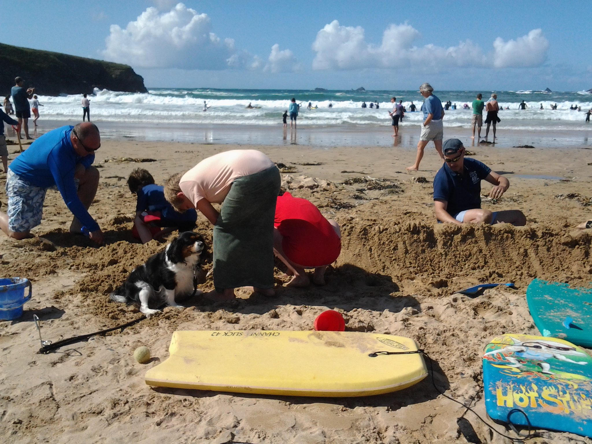G, M and their long-time pal, H, spent a glorious afternoon body-boarding, wave-jumping, rock-pool exploring and building sand defences to protect us from the approaching waves.